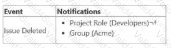 Whenever issues are deleted, only users in the Developers project role are notified but not members of Acme group. Where must Acme group be added to fix this?