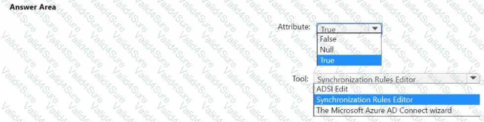 How should you configure the Azure AD Connect cloudFiltered attribute, and which tool should you use? To answer, select the appropriate options in the answer area.