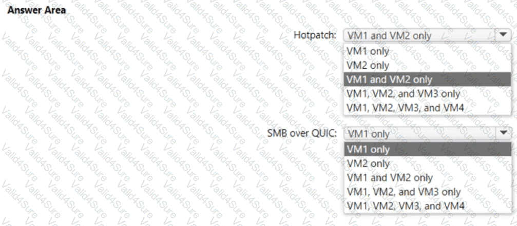 Which virtual machines support Hotpatch, and which virtual machines support SMB over QUIC? To answer select the appropriate options in the answer area.