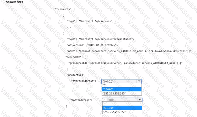 You need to deploy a logical SQL server by using an Azure Resource Manager (ARM) template. The solution must ensure that the server will allow inbound connectivity from any Azure resource.
