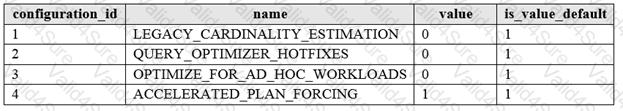 You run the select * from sys.database_scoped_configurations Transact-SQL command and receive the results shown in the following table.