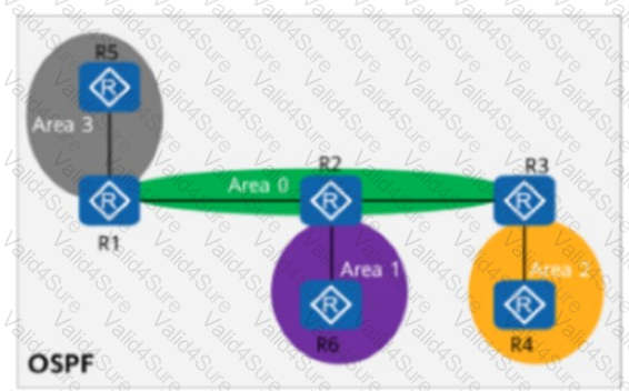 On the OSPF network shown in the figure, area 1 is a common area, area 2 is a stub area, and area 3 is an NSSA. R5 imports an external route 10.0.5.5/32. Given this, which of the following routers does not have the route 10.0.5.5/32 in its routing table?
