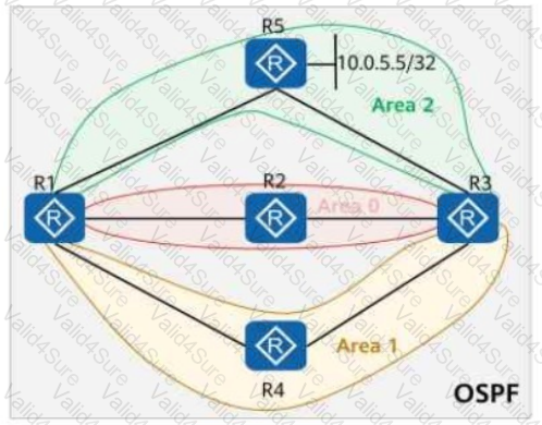 On the OSPF network shown in the figure, area 1 and area 2 are common areas. The IP address of Loopback0 on R5 is 10.0.5.5/32, and OSPF is enabled on this interface. If the abr-summary 10.0.5.0 255.255.255.0 command is run in area 2 (where R1 resides), which of the following routers have the route 10.0.5.0/24 in their routing tables?