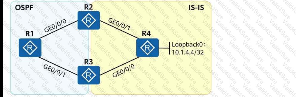 As shown in the following figure, an engineer tests network interconnection between two branches. To implement network interconnection,OSPFis deployed onR1, R2, and R3of branch 1, andIS-ISis deployed onR2, R3, and R4of branch 2. Which of the following operations needs to be performed to allowR1 to access R4's loopback interface address?