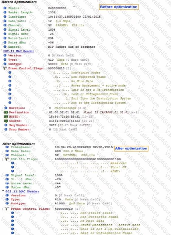 When wireless users join the multicast groups, all users connected to the same WLAN experience poor network performance. However, wired users are not affected in this way. While troubleshooting, the network administrator saves the packet captures shown in the exhibit and concludes that all users, even those not joining the multicast group, receive the same multicast flow at slow speeds.