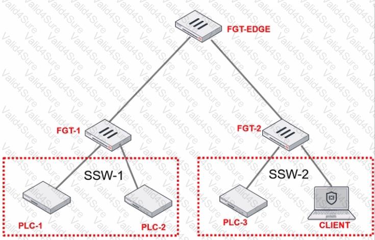 PLC-3 and CLIENT can send traffic to PLC-1 and PLC-2. FGT-2 has only one software switch (SSW-1) connecting both PLC-3 and CLIENT. PLC-3 and CLIENT cannot send traffic to each other.