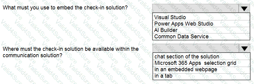 You need to embed the check-in solution into the communication solution. To answer, select the appropriate options in the answer area.
