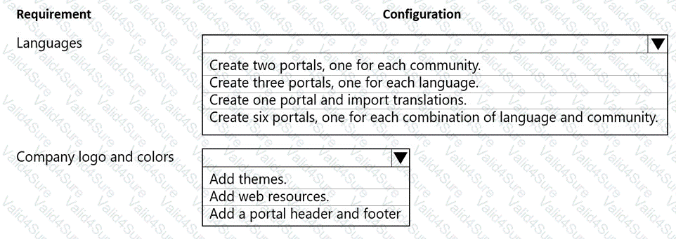 You have a Power Apps portal app that supports a sales community and a service community in the same environment. The only language configured in the environment is English. The company wants to add support for two more languages.
