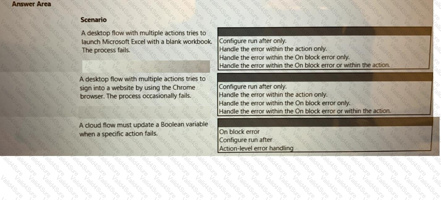 You need to select the appropriate error handling action for the following scenarios. Which actions should you use? To answer, select the appropriate options in the answer area. NOTE: Each correct selection is worth one point.