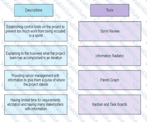A junior project manager with experience in predictive projects has joined a company that uses hybrid approaches for project delivery. A senior project manager with experience in hybrid approaches is assigned to be a coach. Match the activity descriptions on the left to the correct tools on the right.