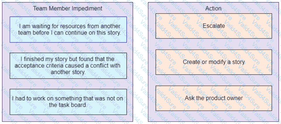 The team has reported the following impediments at the daily standup meeting Drag each impediment on the left to the action that the project manager needs to take on the right