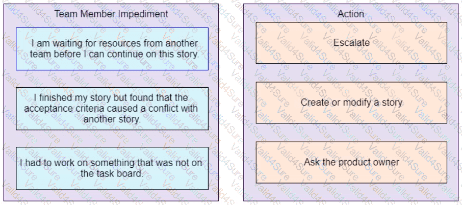 The team has reported the following impediments at the daily standup meeting Drag each impediment on the left to the action that the project manager needs to take on the right
