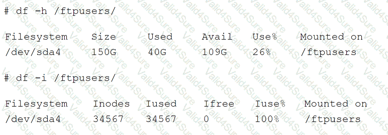 Users are unable to create new files on the company's FTP server, and an administrator is troubleshooting the issue. The administrator runs the following commands: