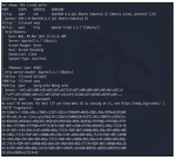 Refer to the exhibit A penetration tester runs the Nmap scan against the company server to uncover possible vulnerabilities and exploit them Which two elements can the penetration tester identity from the scan results? (Choose two.)