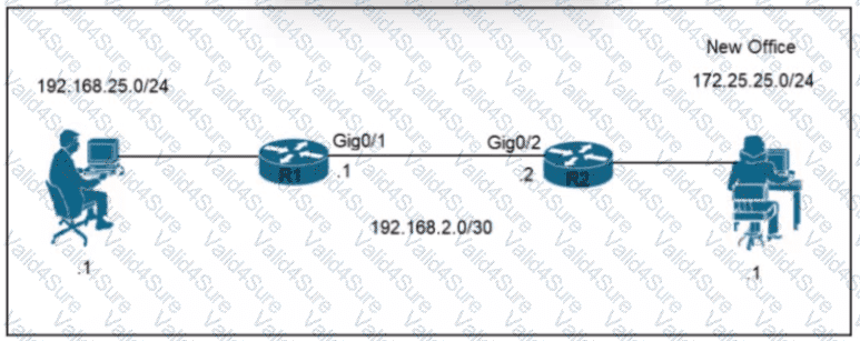 A network engineer is updating the configuration on router R1 to connect a new branch office to the company network R2 has been configured correctly. Which command must the engineer configure so that devices at the new site communicate with the main office?