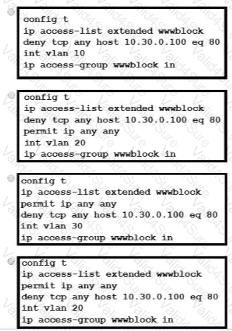 A network engineer must block access for all computers on VLAN 20 to the web server via HTTP All other computers must be able to access the web server Which configuration when applied to switch A accomplishes this task?