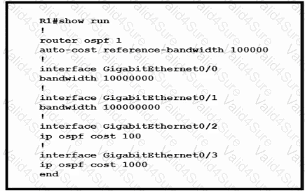 Router R1 resides in OSPF Area 0. After updating the R1 configuration to influence the paths that it will use to direct traffic, an engineer verified that each of the four Gigabit interfaces has the same route to 10.10.0.0/16. Which interface will R1 choose to send traffic to reach the route?
