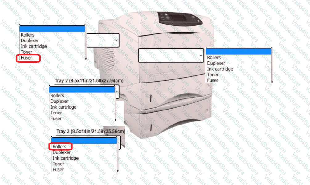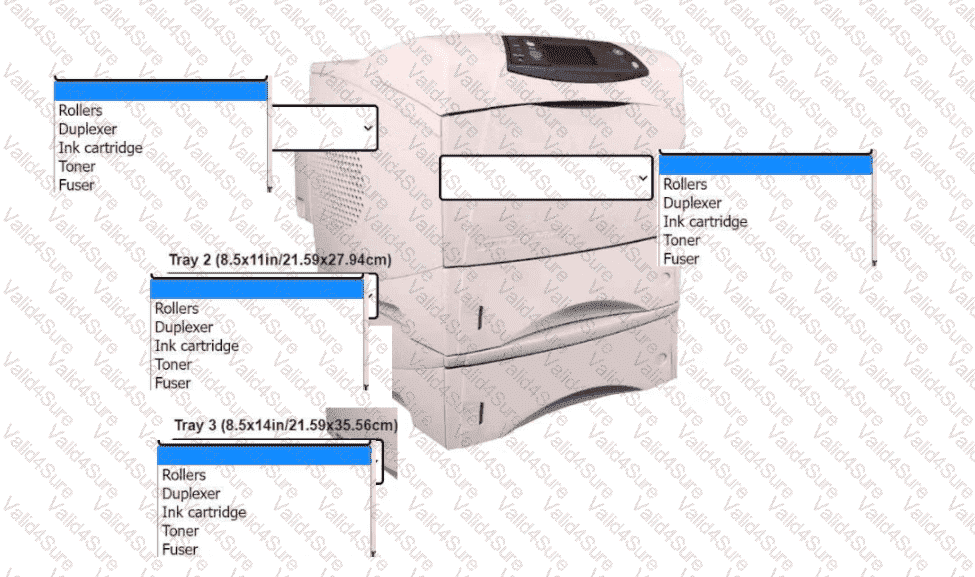 Using the available printer parts, replace only the faulty components on the office printer to resolve the stated issues.