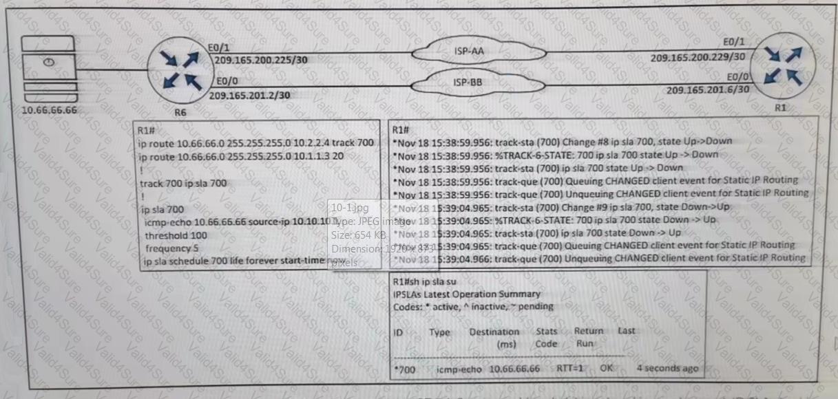 An engineer configured IP SLA on R1 to avoid the ISP link flapping problem. but it is not working as designed IP SLA should wait 30 seconds before switching traffic to a secondary connection and then revert to the primary link after waning 20 seconds, when the primary link is available and stabilized. Which configuration resolves the issue?