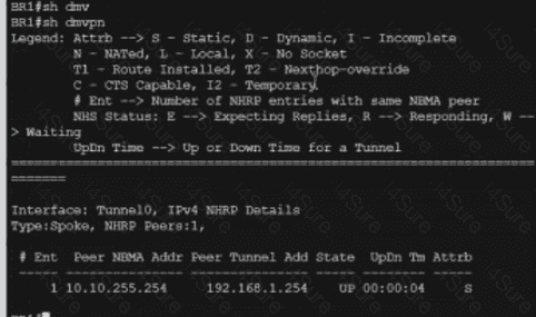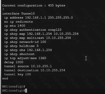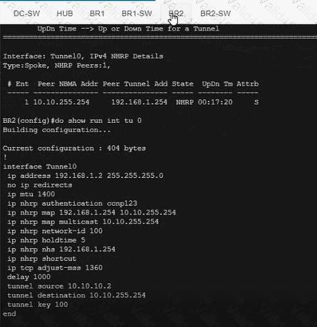 A DMVPN network is preconfigured with tunnel 0 IP address 192.168.1.254 on the HUB, IP connectivity, crypto policies, profiles, and EIGRP AS 100. The NHRP password is ccnp123, and the network ID and tunnel key is EIGRP ASN Do not introduce a static route. Configure DMVPN connectivity between routers BR1 and BR2 to the HUB router using physical interface as the tunnel source to achieve these goals: