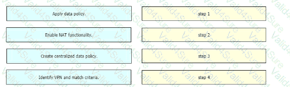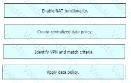 Drag and drop the actions from the left into the correct sequence on the right to create a data policy to direct traffic to the Internet exit.
