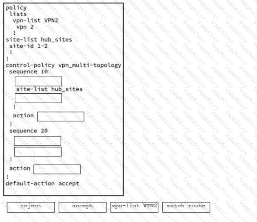 Drag and drop the configuration command snippets from the bottom onto the boxes for the branches control policy configuration in the outward direction to establish a strict hub-and-spoke topology for VPN2. Not all options are used. Some options are used more than once.