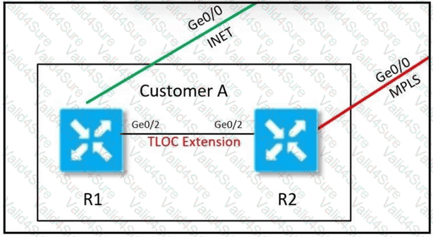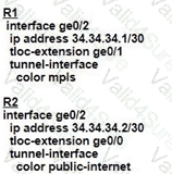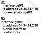 An MPLS connection on R2 must extend to R1 Users behind R1 must have dual connectivity for data traffic Which configuration provides R1 control connectivity over the MPLS connection?