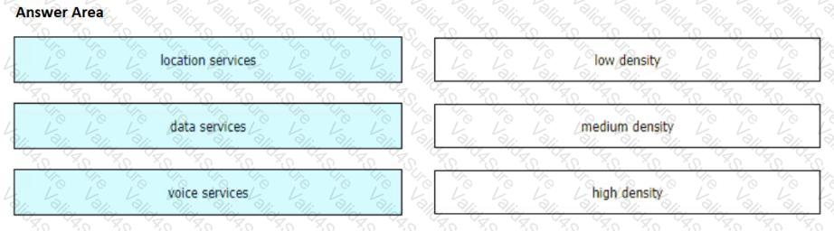A wireless consultant is creating a wireless design for a multistory building. The building will house several groups that will use the wireless network for different operations. Depending on how the wireless network is used, different wireless approach designs must be taken. Drag and drop the services from the left onto the AP density levels on the right based on the wireless deployment requirements.
