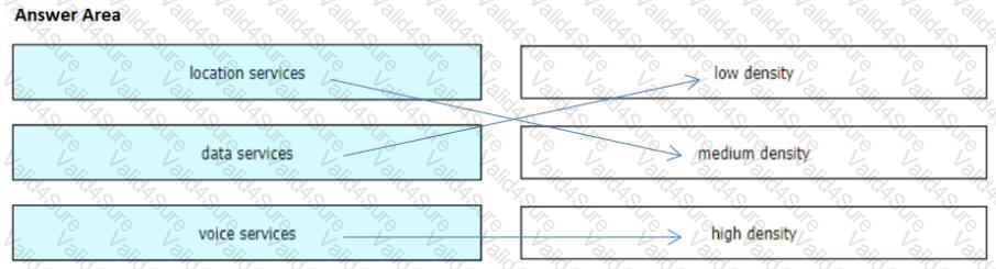 A wireless consultant is creating a wireless design for a multistory building. The building will house several groups that will use the wireless network for different operations. Depending on how the wireless network is used, different wireless approach designs must be taken. Drag and drop the services from the left onto the AP density levels on the right based on the wireless deployment requirements.