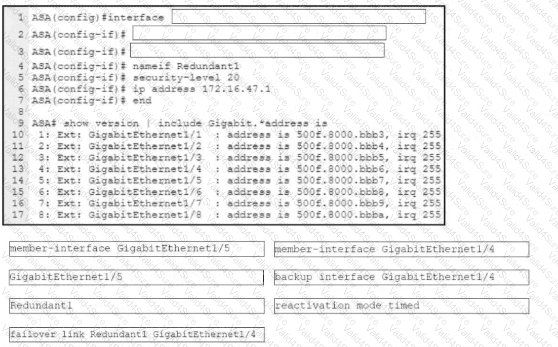 Refer to the exhibit. An engineer must configure a connection on a Cisco ASA Firewall with a Cisco Secure Firewall Services Module to ensure that the secondary interface takes over all the functions of the primary interface if the primary interface fails. Drag and drop the code snippets from the bottom onto the boxes in the CLI commands to configure the failover. Not all options are used.