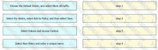 An engineer must create a basic access control policy in the Cisco Secure Firewall Management Center to block all traffic by default. Drag and drop the configuration actions from the left into sequence on the right.