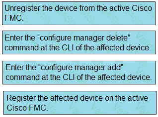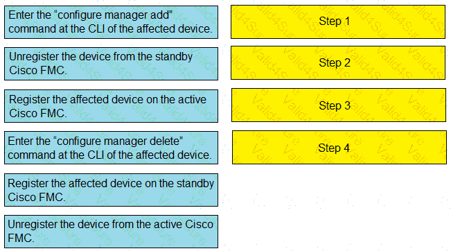 Drag and drop the steps to restore an automatic device registration failure on the standby Cisco FMC from the left into the correct order on the right. Not all options are used.