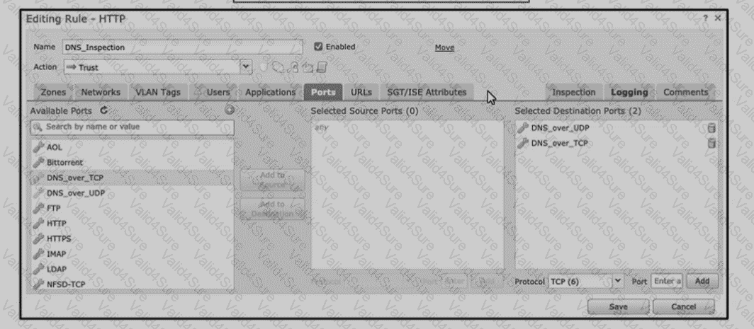 Refer to the exhibit An engineer is modifying an access control pokey to add a rule to inspect all DNS traffic that passes through the firewall After making the change and deploying thepokey they see that DNS traffic is not bang inspected by the Snort engine What is the problem?