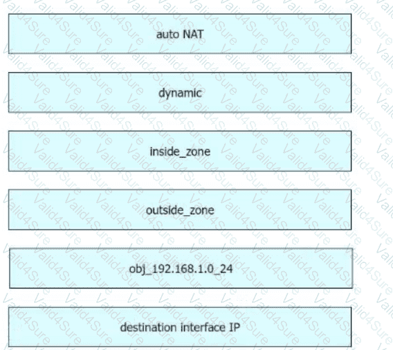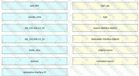 Refer to the exhibit. An engineer configures a NAT rule allowing clients to use the internet only if clients are located on the directly connected internal network. Dynamic auto PAT must be configured. Drag and drop the NAT rules from the left onto the corresponding targets on the right. Not all options are used.