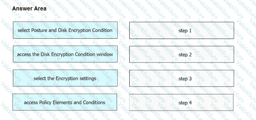 An engineer needs to configure a compliance policy on Cisco ISE to ensure that the latest encryption software is running on the C drive of all endpoints. Drag and drop the configuration steps from the left into the sequence on the right to accomplish this task.