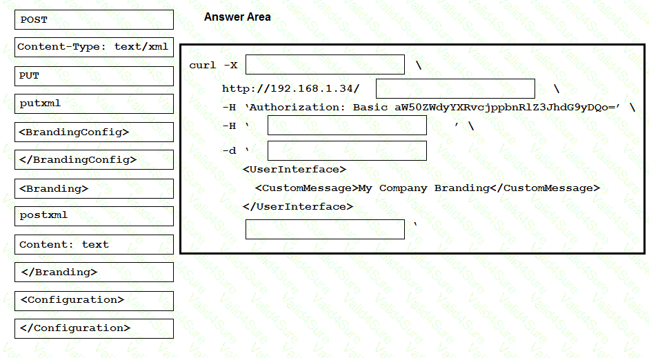 Drag and drop the commands from the left onto the curl command to create a custom branding message using the xAPI HTTP API. Not all options are used.