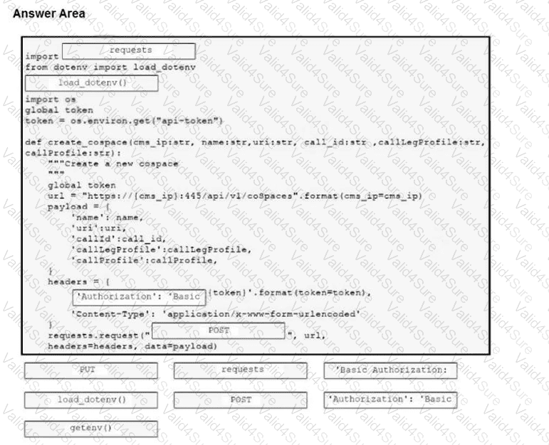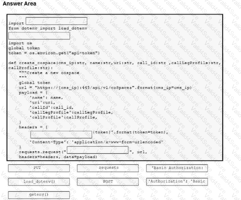 Drag and drop the code snippets from the bottom onto the blanks in the Python script to create a new coSpace on the Cisco Meeting Server. Not all options are used.