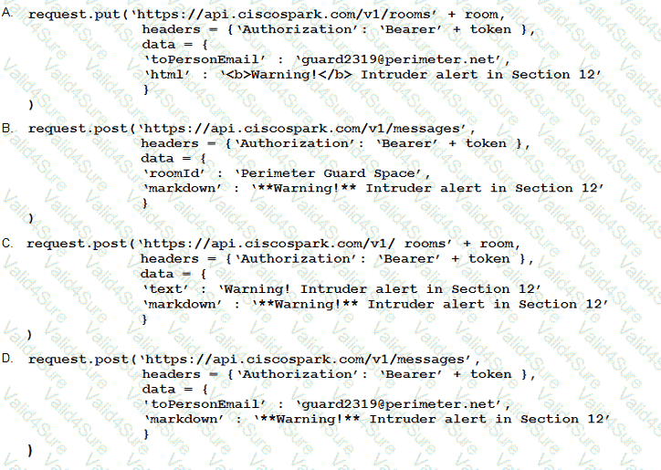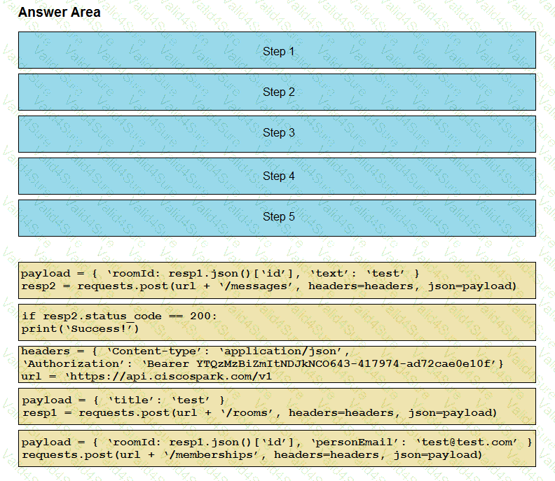 Drag and drop the code snippets into the correct order to create a Python Webex Teams REST API script that performs this sequence of tasks: create a Space, add a user to the Space, post the word “test†in the Space. Assume that the Python “requests†module has already been imported.