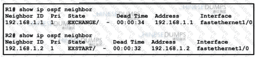 Refer to the exhibit. A company recently deployed a new network using OSPF in the core to share routes. The network administrator selected OSPF as the routing protocol because of its ability to maintain a route database. When the new network was started up, all routers booted normally, but the link between routers R1 and R2 failed to come up. The two routers are located in the same rack at the data center. Which task should an engineer perform to correct the problem?