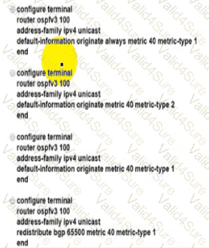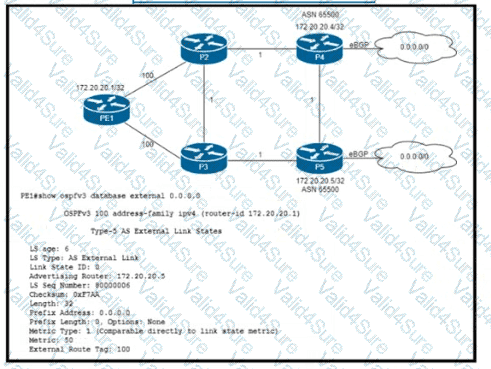 Refer to the exhibit. Router P4 and P5 receive the 0.0.0.0/0 route from the ISP via eBGP peering P4 is the primary Internet gateway router, and P5 is its Backup. P5 is already advertising a default route into OSPF domain. Which configuration must Be applied to P4 so that advertises a default route Into OSPF and Becomes me primary internet gateway for the network?