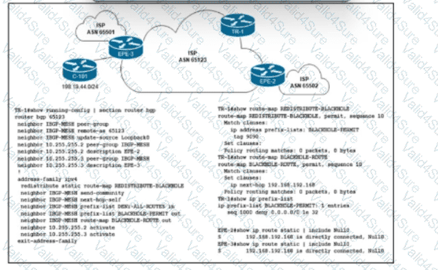 Refer to the exhibit. Customer C-101 in ASN 65123 requested that the ISP blackholes a host route 198.19.44.195, to which the customer is receiving a significant amount of malicious traffic. Which configuration must the network engineer implement on the trigger router TR-1 to fulfill the request without affecting other IP destinations in the customer's block?