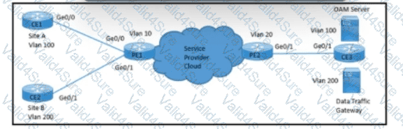 Refer to the exhibit. A network engineer with an employee ID: 5086:72:817 is configuring a connection to manage CE1 from the OAM server on VLAN 100. PE1 must push S-VLAN tag 10 toward PE2 while forwarding traffic from CE1 to the OAM server. PE1 must push S-VLAN tag 20 toward PE2 while forwarding traffic from CE2 to the data traffic gateway. Which configuration must the engineer implement on PE2?