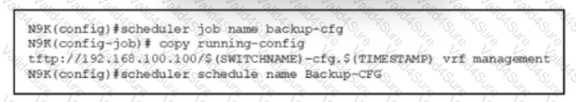 Refer to the exhibit. Which command set must be used to complete the configuration that configures a Cisco Nexus 9000 Series server scheduler to perform the backup of It’s configuration every Wednesday at 8:00 am?