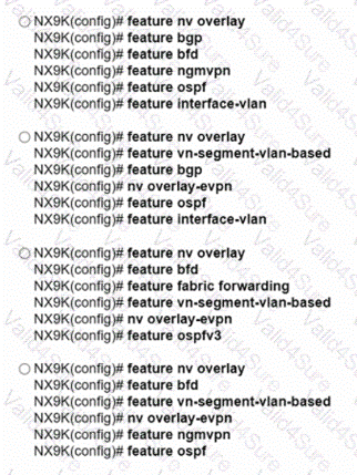 An engineer musà perform an initial configuration of VXLAN and MP-BGP EVPN on the Cisco Nexus 9000 Series platform. The underlay must be OSPF. and the VTEP must run with distributed default gateway on a VLAN interface. Which command set must be applied to meet these requirements?