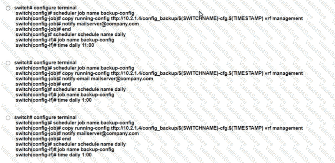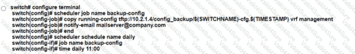A network administrator must create a daily scheduler job on a Cisco Nexus 9000 Senes Switch to back up the device configuration and transfer the backed-up configuration to an external server The backup task must meet these requirements