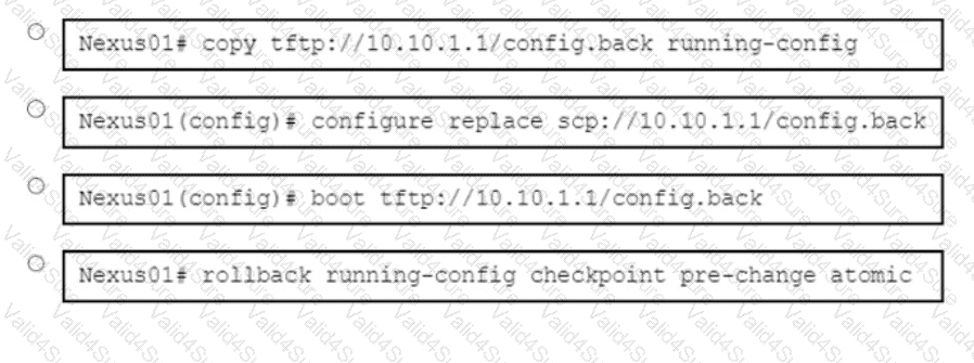 A network engineer must restore the configuration of a Cisco Nexus 9300 Series Switch The backup file is stored on an external server The current configuration must be replaced without having to reload the switch Which command must be used to accomplish this goal?