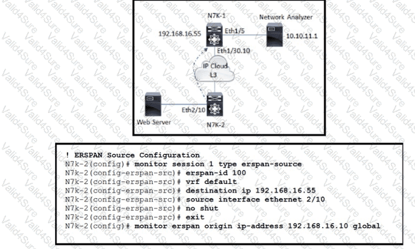 Refer to the exhibit. An engineer is implementing an ERSPAN configuration to mirror web server traffic connected to N7K-2. Which ERSPAN configuration must be applied on N7K-1 to forward traffic to the network analyzer?