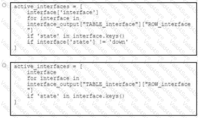 Refer to the exhibit An engineer creates a Python script to run in the native Python environment of a Cisco Nexus 9000 Series Switch The standard output of the script displays a list of the names of active interfaces on the switch Which code snippet parses the content of the interface_output variable to create the specified list?