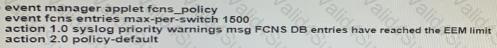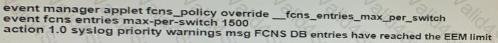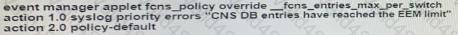 AN engineer is asked to modify an overridden policy by changing the number of FCNS database entries to 1500 and then generable a massage. What configuration will accomplish this task?