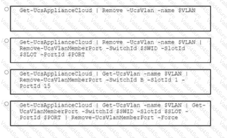 An engineer must create a PowerShell script that leverages the Cisco UCS Manager PowerShell module to submit automated requests to Cisco UCS Manager The engineer must automate the removal of switches from VLANs Environment variadlos must provido the VLAN name and switch identifiers. The VLAN must persist when it is removed from tho switch port Which command must the engineer include in the script to accomplish these goals?
